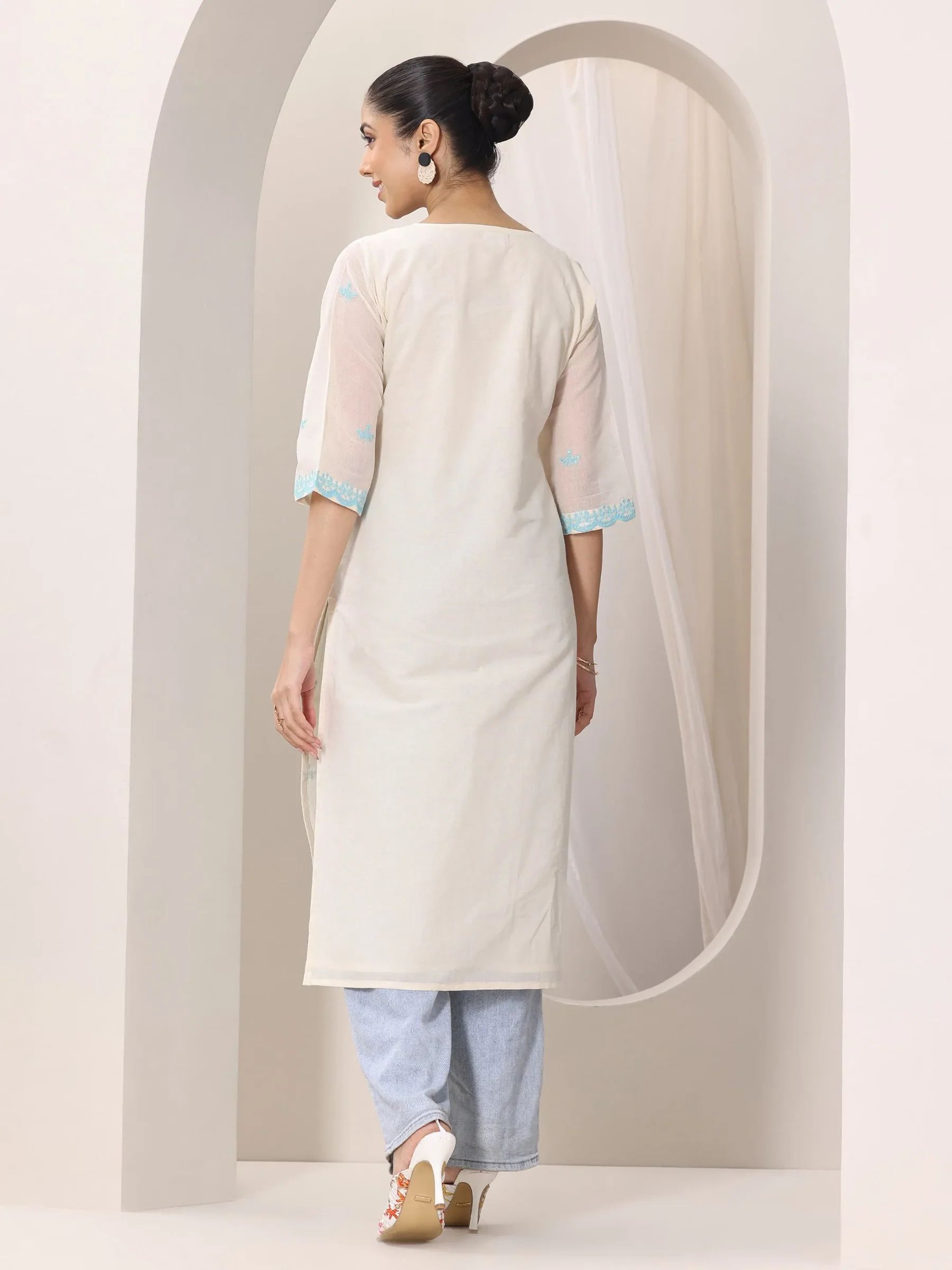 Off white Embroidered Cotton Straight Kurta