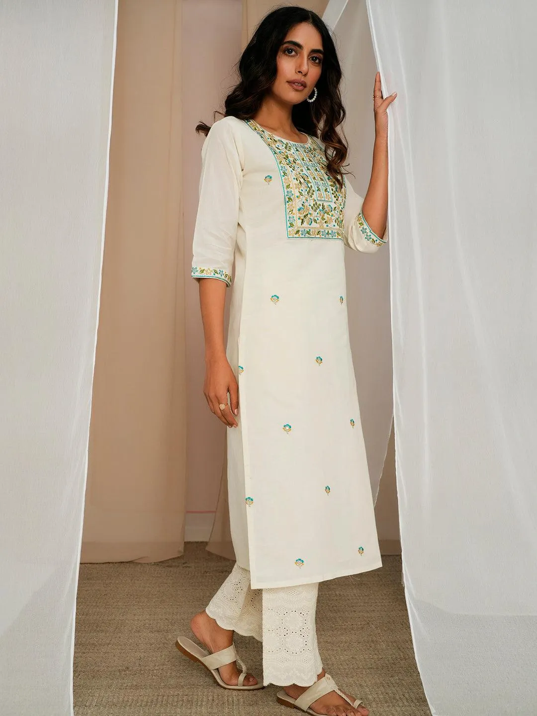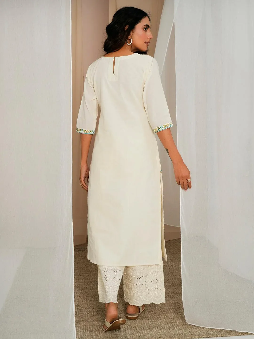 Off White Embroidered Cotton Straight Kurta