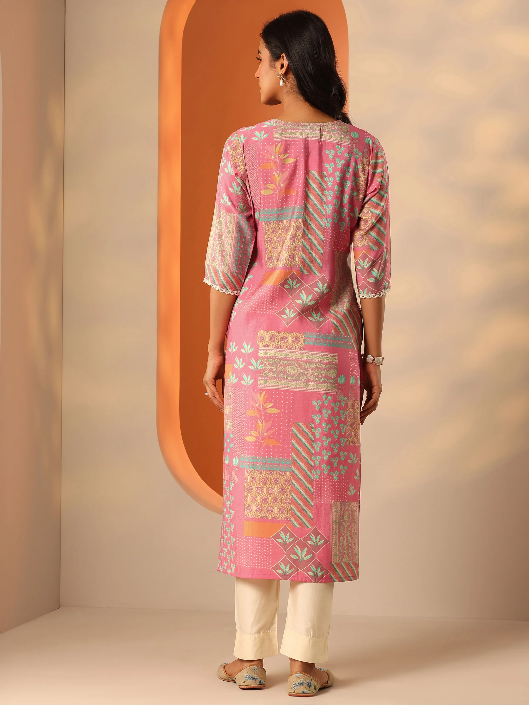 Pink Printed Silk Blend Straight Kurta
