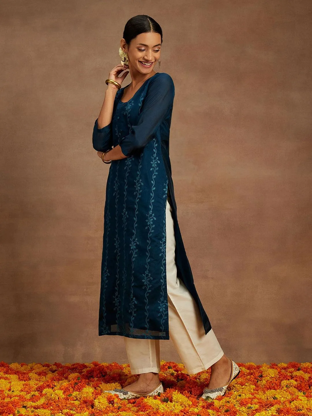 Teal Embroidered Chanderi Silk Straight Kurta